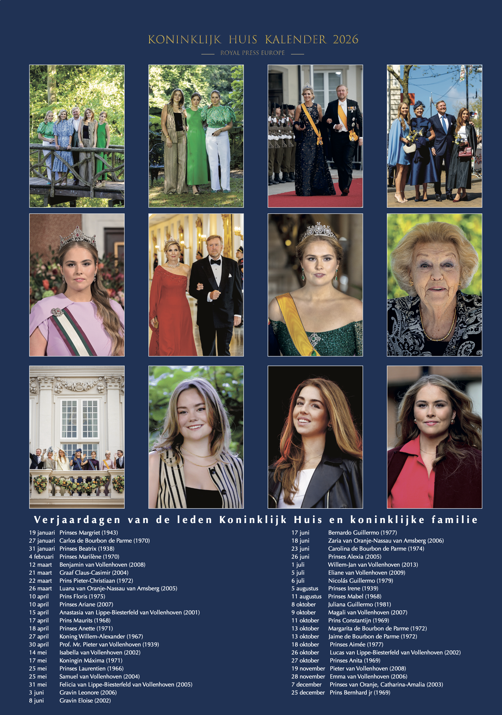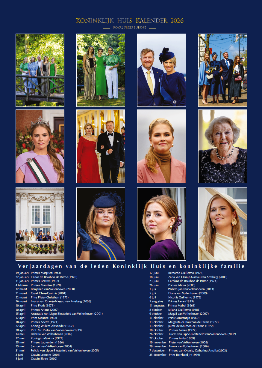 Royal Press Europe Koningshuiskalender 2026 met de mooiste foto's van de koninklijke familie in 2025 met als extra: achterkanten van de kalendermaanden zijn ook met fraaie foto's bedrukt!